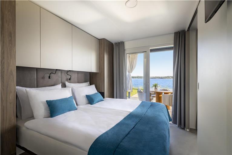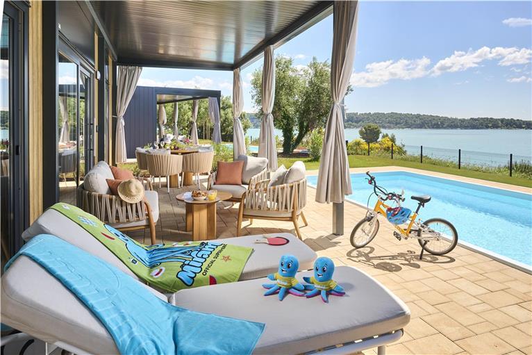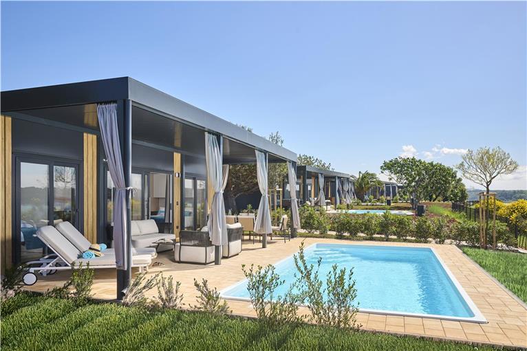 Klimatizované mobilní domy o rozloze 30 - 32 m2 mají jednu dvoulůžkovou ložnici s manželským lůžkem a druhou ložnici s oddělenými lůžky, obývací prostor s plně vybaveným kuchyňským koutem (lednice, myčka nádobí, rychlovarná konvice, kávovar) a rozkládací pohovkou (přistýlka), 2x koupelna s toaletou (fén, toaletní papír), SAT/TV, prostorná terasa.